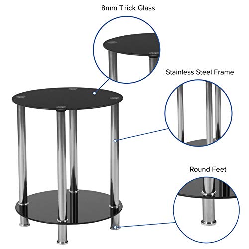 Flash Furniture Riverside Collection Black Glass End Table with Shelves and Stainless Steel Frame