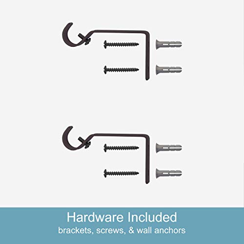 Drapery Hardware Set Includes: one telescoping steel curtain rod with decorative finials (1.94″ L x 1.45″ W x 1.45″ H), two mounting brackets, screws, drywall anchors, and installation instructions.