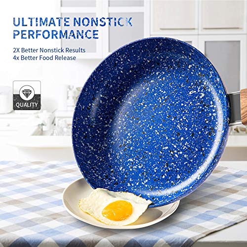 CLASSY & ELEGANT DESIGN – Michelangelo’s granite frying pan set is designed with classy marble looking surface which is made out of all natural coating colors. With the ergonomic soft touch wooden looking handles, this stone skillets nonstick set is a beautiful addition to your kitchen. Skillets Nonstick Set includes 9 1/2 and 11 inch frying pans – the optimal size for day-to-day cooking