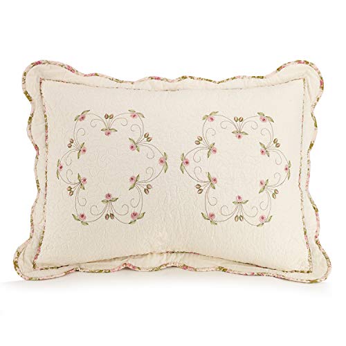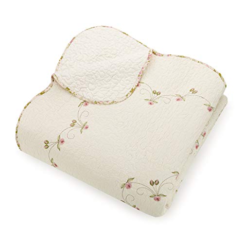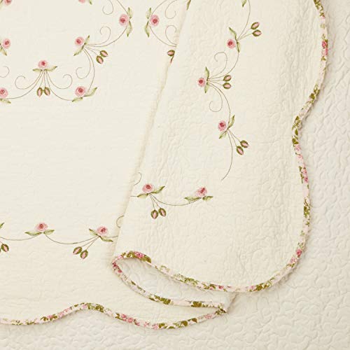 A sweet charming classic quilt that never goes out of style. Embroidered with wreaths of soft pink rose buds and sweet green leaves for a delicate design. The binding is made of a pink floral fabric that adds a touch of pattern. The scalloped edges give this quilt a feminine touch. All over vermicelli quilting ties everything together. 100% cotton face and fill with a brushed polyester backing.