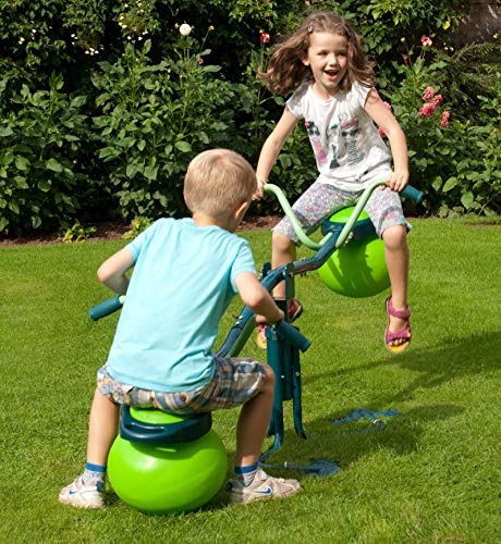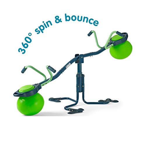 TP Toys brings you a bigger and stronger outdoor version of the SpiroBouncer. The TP Active Spiro Hop Bouncer is a seesaw where kids can comfortably seat, bounce up and down, and spin around and around for hours! Designed for active play that delivers smiles, giggles and joy! With the Spiro Hop Bouncer everyone can play! The balance point is adjustable so children of different weights can play together. This fun spinner toy is also height-adjustable ensuring years of play and fun. The Spiro Hop award-winning patented design features large and inflatable soft ball seats to minimize impact and maximize bounce. The padded-feet base makes this spinning seesaw suitable and safe for indoor and outdoor use. Help your child develop coordination and balance skills. Parents will enjoy watching their kids having a great time; they can also join the fun by guiding the motions up, down, and around using the assist handle on the seats. Made of high-quality materials, the Spiro Hop is built to last! Steel body construction, inflatable vinyl seats, and durable plastic feet. Pump included. Assembly required. Suitable for children ages 3 to 9 years with a maximum weight of 75 lbs. per seat.