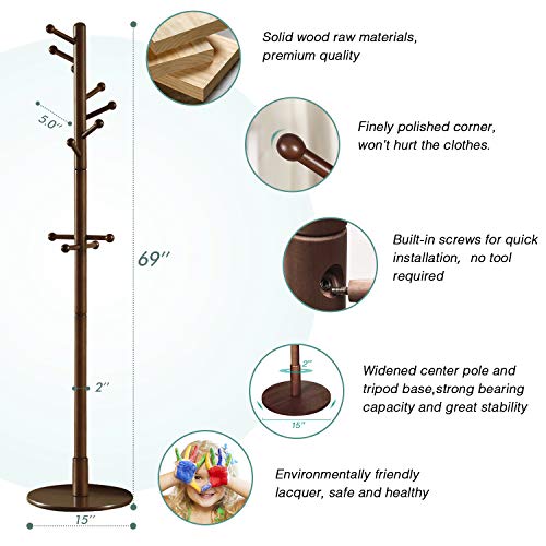 SOLID CONSTRUCTION: This coat hanger is made by real rubber wood coated with environmentally friendly lacquer, which is waterproof, anti-corrosion and non-toxic. Widened 2” center pole and 15” round base, add durability and stability to the coat rack stand. Natural and smooth finish rounded corners will protect your hands and garments from being scratched.